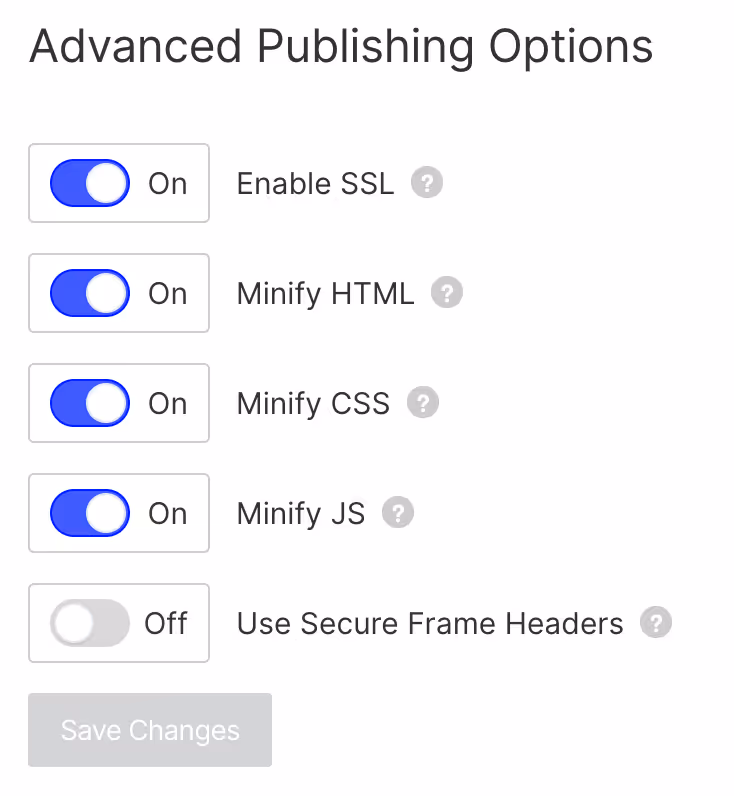 CSS and JavaScript files can slow the site's loading time. Webflow provides a simple and effective way to minimize HTML, CSS, and JavaScript files. By using Webflow's native settings, you can easily compress these files to reduce their size, which can help to improve your site's loading speed and overall performance. This feature can be accessed through Webflow's settings menu, making it a straightforward process that can have a significant impact on your site's performance.
